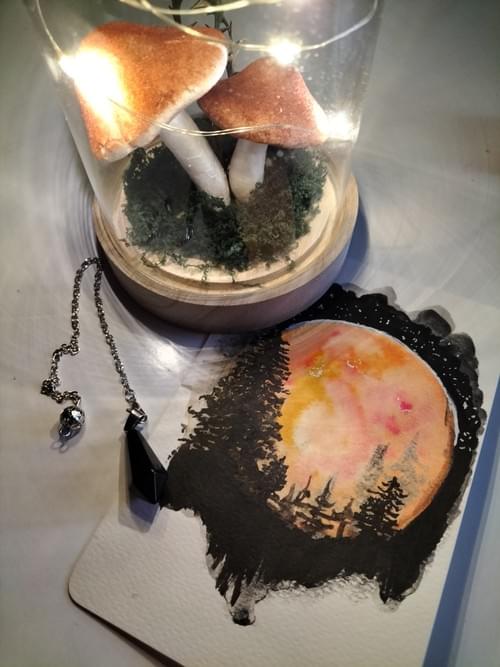 Este es el bosque de Irwin. Todos los seres del bosque provienen de este mágico lugar, que he canalizado durante varios meses. En él podrás conectar con tu yo más profundo para sacar tus miedos al exterior y ayudarte a liberar bloqueos y sanar tu alma. Es una materialización del chakra corazón. El péndulo que lo acompaña es de ágata negra, una piedra que no solo limpia el aura de bloqueos y residuos energéticos, sino que también ayuda a liberar patrones de pensamiento negativos y miedos arraigados, promoviendo así la paz interior. Su vibración oscura y profunda nos invita a mirar hacia nuestro interior, enfrentando y liberando aquello que ya no nos sirve, para abrirnos a una transformación consciente. Es una aliada poderosa para quienes buscan purificar su campo energético y fortalecer su ser desde la raíz.